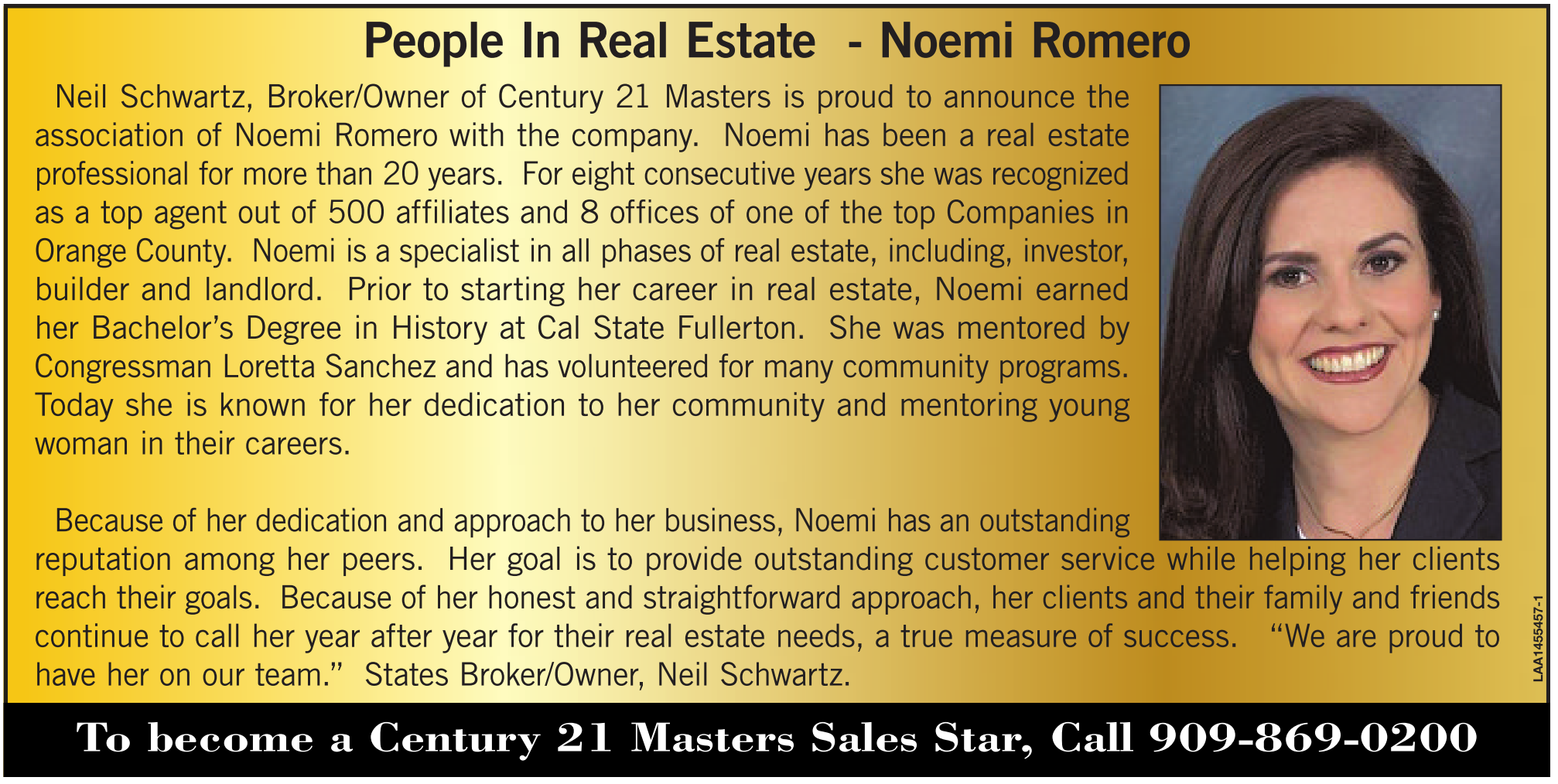 Neil Schwartz, Broker/Owner of Century 21 Masters is proud to announce the association of Noemi Romero with the company. Noemi has been a real estate professional for more than 20 years. For eight consecutive years she was recognized as a top agent out of 500 affiliates and 8 offices of one of the top Companies in Orange County. Noemi is a specialist in all phases of real estate, including, investor, builder and landlord. Prior to starting her career in real estate, Noemi earned her Bachelor’s Degree in History at Cal State Fullerton. She was mentored by Congressman Loretta Sanchez and has volunteered for many community programs. Today she is known for her dedication to her community and mentoring young woman in their careers.