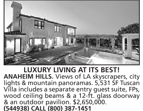 ANAHEIM HILLS. Views of LA skyscrapers, city lights &mountain panoramas. 5,531 SF Tuscan Villa includesaseparate entry guest suite, FPs, wood ceiling beams & a 12-ft. glass doorway & an outdoor pavilion. $2,650,000. (544938) CALL (800) 387-1451
