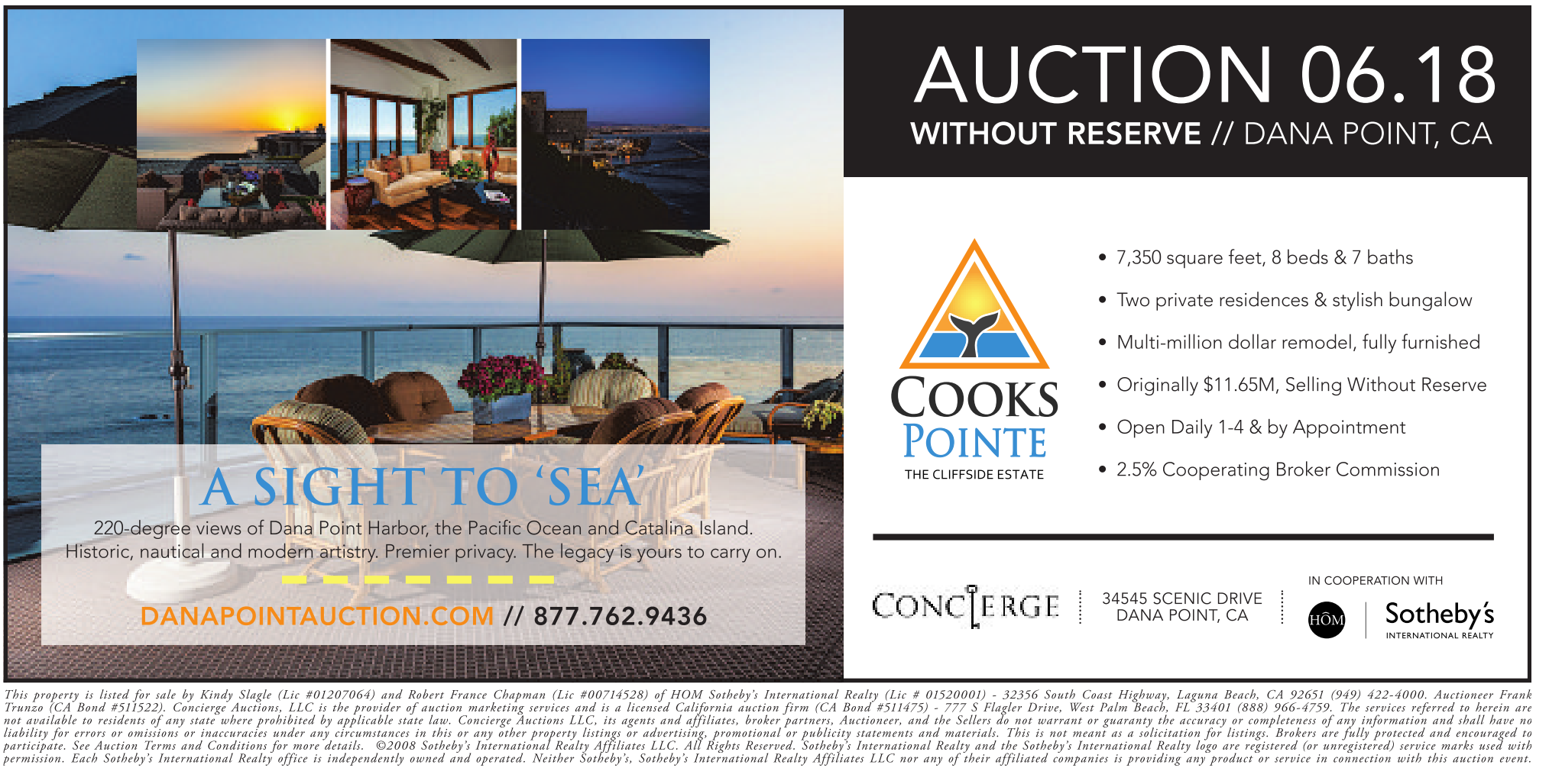 This property is listed for sale by Kindy Slagle (Lic #01207064) and Robert France Chapman (Lic #00714528) of HOM Sotheby’s International Realty (Lic # 01520001) - 32356 South Coast Highway, Laguna Beach, CA 92651 (949) 422-4000. Auctioneer Frank Trunzo (CA Bond #511522). Concierge Auctions, LLC is the provider of auction marketing services and is a licensed California auction firm (CA Bond #511475) - 777 S Flagler Drive, West Palm Beach, FL 33401 (888) 966-4759. The services referred to herein are not available to residents of any state where prohibited by applicable state law. Concierge Auctions LLC, its agents and affiliates, broker partners, Auctioneer, and the Sellers do not warrant or guaranty the accuracy or completeness of any information and shall have no liability for errors or omissions or inaccuracies under any circumstances in this or any other property listings or advertising, promotional or publicity statements and materials. This is not meant as a solicitation for listings. Brokers are fully protected and encouraged to participate. See Auction Terms and Conditions for more details. ©2008 Sotheby’s International Realty Affiliates LLC. All Rights Reserved. Sotheby’s International Realty and the Sotheby’s International Realty logo are registered (or unregistered) service marks used with permission. Each Sotheby’s International Realty office is independently owned and operated. Neither Sotheby’s, Sotheby’s International Realty Affiliates LLC nor any of their affiliated companies is providing any product or service in connection with this auction event.