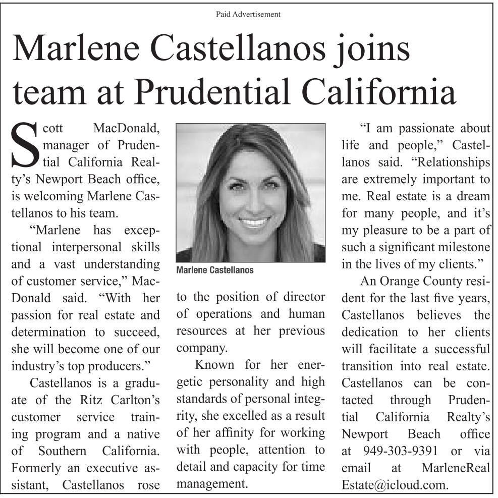 An Orange County resident for the last five years, Castellanos believes the dedication to her clients will facilitate a successful transition into real estate. Castellanos can be contacted through Prudential California Realty’s Newport Beach office at 949-303-9391 or via email at MarleneReal Estate@icloud.com.