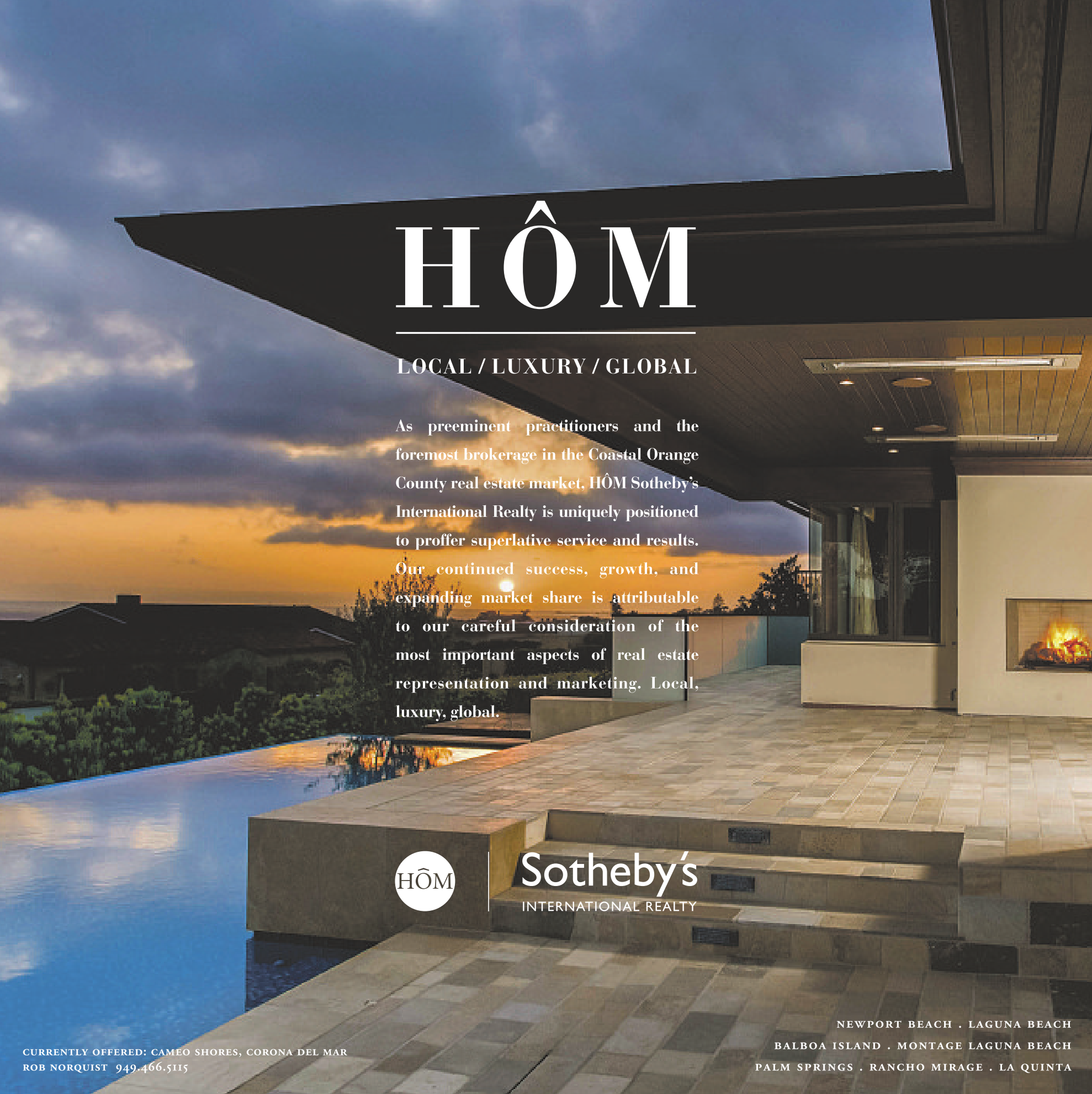 H Ô M LOCAL / LUXURY / GLOBAL As preeminent practitioners and the foremost brokerage in the Coastal Orange County real estate market, HÔM Sotheby’s International Realty is uniquely positioned to proffer superlative service and results. Our continued success, growth, and expanding market share is attributable to our careful consideration of the most important aspects of real estate representation and marketing. Local, luxury, global. currently offered: cameo shores, corona del mar rob norquist 949.466.5115 newport beach . laguna beach balboa island . montage laguna beach palm springs . rancho mirage . la quinta