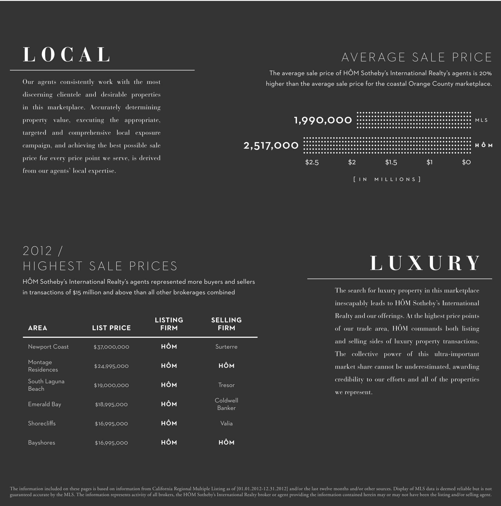 The information included on these pages is based on information from California Regional Multiple Listing as of [01.01.2012-12.31.2012] and/or the last twelve months and/or other sources. Display of MLS data is deemed reliable but is not guaranteed accurate by the MLS. The information represents activity of all brokers, the HÔM Sotheby’s International Realty broker or agent providing the information contained herein may or may not have been the listing and/or selling agent.