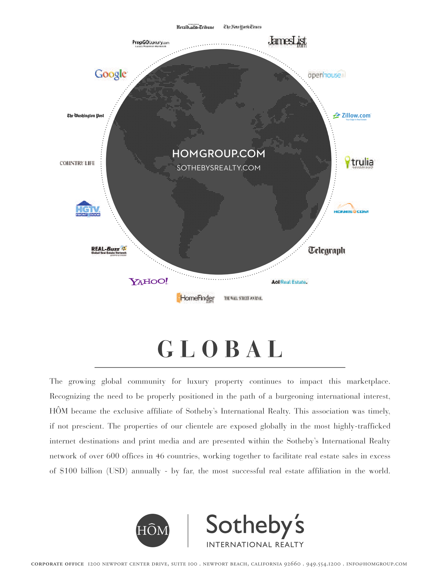 HOMGROUP.COM SOTHEBYSREALTY.COM G L O B A L The growing global community for luxury property continues to impact this marketplace. Recognizing the need to be properly positioned in the path of a burgeoning international interest, HÔM became the exclusive affiliate of Sotheby’s International Realty. This association was timely, if not prescient. The properties of our clientele are exposed globally in the most highly-trafficked internet destinations and print media and are presented within the Sotheby’s International Realty network of over 600 offices in 46 countries, working together to facilitate real estate sales in excess of $100 billion (USD) annually - by far, the most successful real estate affiliation in the world. corporate office 1200 newport center drive, suite 100 . newport beach, california 92660 . 949.554.1200 . info@homgroup.com