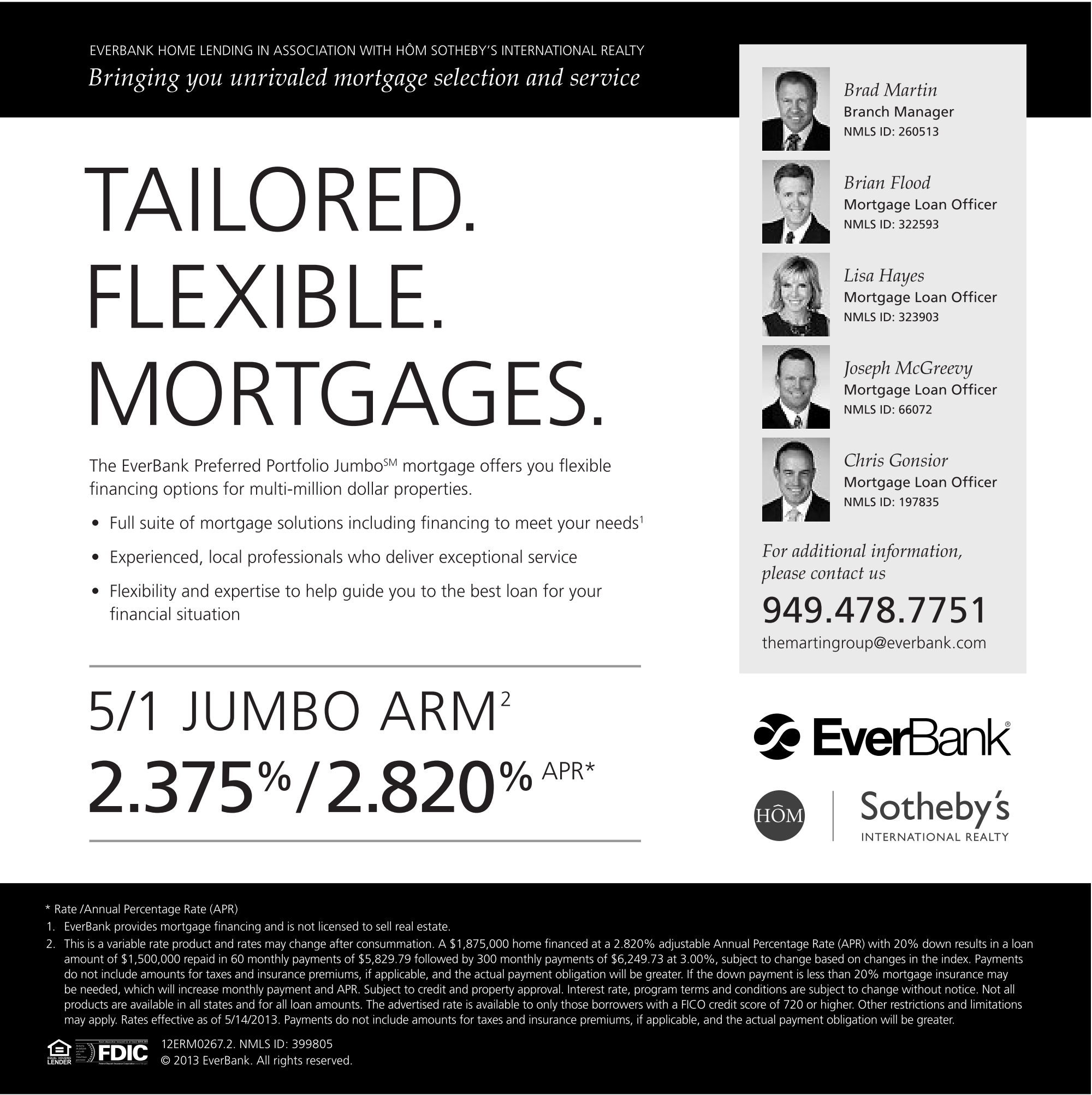 * Rate /Annual Percentage Rate (APR) 1. EverBank provides mortgage financing and is not licensed to sell real estate. 2. this is a variable rate product and rates may change after consummation. A $1,875,000 home financed at a 2.820% adjustable Annual Percentage Rate (APR) with 20% down results in a loan amount of $1,500,000 repaid in 60 monthly payments of $5,829.79 followed by 300 monthly payments of $6,249.73 at 3.00%, subject to change based on changes in the index. Payments do not include amounts for taxes and insurance premiums, if applicable, and the actual payment obligation will be greater. If the down payment is less than 20% mortgage insurance may be needed, which will increase monthly payment and APR. Subject to credit and property approval. Interest rate, program terms and conditions are subject to change without notice. Not all products are available in all states and for all loan amounts. the advertised rate is available to only those borrowers with a FIco credit score of 720 or higher. other restrictions and limitations may apply. Rates effective as of 5/14/2013. Payments do not include amounts for taxes and insurance premiums, if applicable, and the actual payment obligation will be greater.