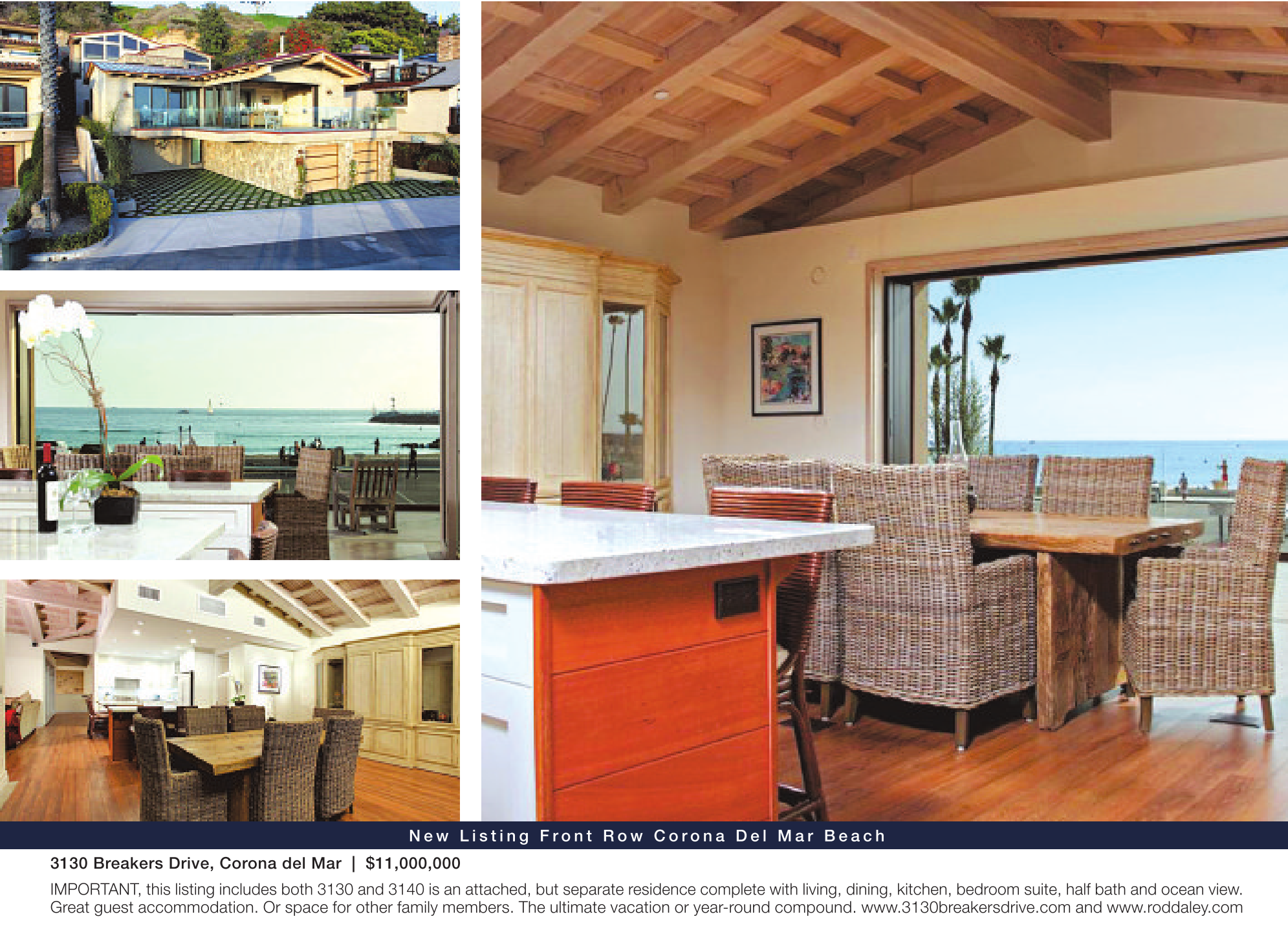 IMPORTANT, this listing includes both 3130 and 3140 is an attached, but separate residence complete with living, dining, kitchen, bedroom suite, half bath and ocean view. Great guest accommodation. Or space for other family members. The ultimate vacation or year-round compound. www.3130breakersdrive.com and www.roddaley.com