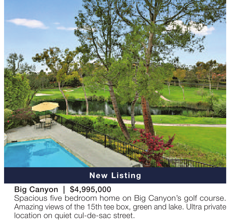 Big Canyon | $4,995,000 Spacious five bedroom home on Big Canyon’s golf course. Amazing views of the 15th tee box, green and lake. Ultra private location on quiet cul-de-sac street.
