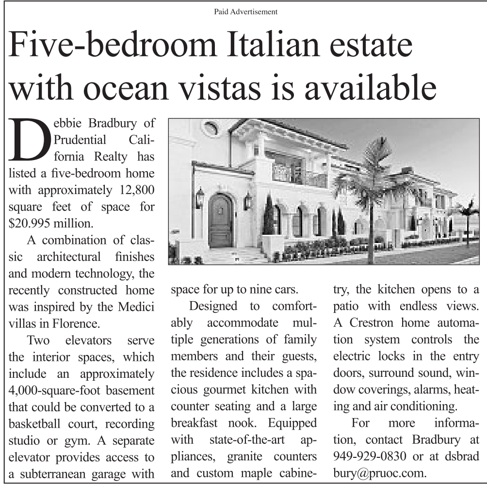 Five-bedroom Italian estate with ocean vistas is available Debbie Bradbury of Prudential California Realty has listed a five-bedroom home with approximately 12,800 square feet of space for $20.995 million. A combination of classic architectural finishes and modern technology, the recently constructed home was inspired by the Medici villas in Florence. Two elevators serve the interior spaces, which include an approximately 4,000-square-foot basement that could be converted to a basketball court, recording studio or gym. A separate elevator provides access to a subterranean garage with Paid Advertisement space for up to nine cars. Designed to comfortably accommodate multiple generations of family members and their guests, the residence includes a spacious gourmet kitchen with counter seating and a large breakfast nook. Equipped with state-of-the-art appliances, granite counters and custom maple cabine try, the kitchen opens to apatio with endless views. A Crestron home automation system controls the electric locks in the entry doors, surround sound, window coverings, alarms, heating and air conditioning. For more information, contact Bradbury at 949-929-0830 or at dsbrad bury@pruoc.com.