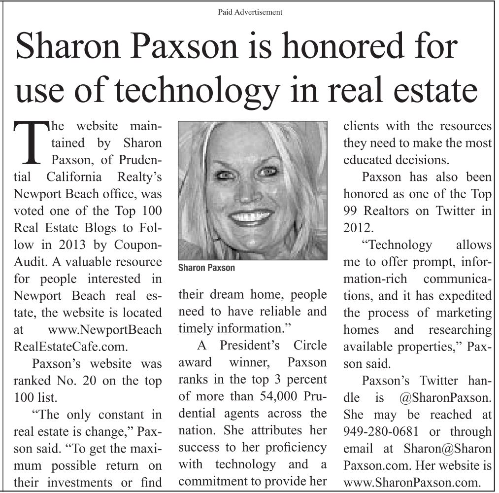 website maintained by Sharon Paxson, of Prudential California Realty’s Newport Beach office, was voted one of the Top 100 Real Estate Blogs to Follow in 2013 by Coupon- Audit. A valuable resource for people interested in Newport Beach real estate, the website is located at www.NewportBeach RealEstateCafe.com.