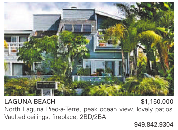 LAGUNA BEACH $1,150,000 North Laguna Pied-a-Terre, peak ocean view, lovely patios. Vaulted ceilings, fireplace, 2BD/2BA 949.842.9304