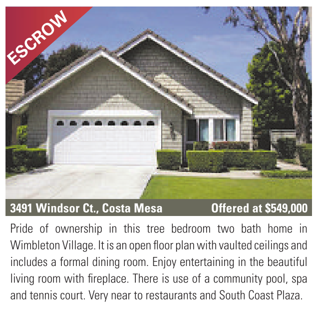 3491 Windsor Ct., Costa Mesa Offered at $549,000 Pride of ownership in this tree bedroom two bath home in Wimbleton Village. It is an open floor plan with vaulted ceilings and includes a formal dining room. Enjoy entertaining in the beautiful living room with fireplace. There is use of a community pool, spa and tennis court. Very near to restaurants and South Coast Plaza.