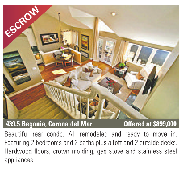439.5 Begonia, Corona del Mar Offered at $899,000 Beautiful rear condo. All remodeled and ready to move in. Featuring 2 bedrooms and 2 baths plus a loft and 2 outside decks. Hardwood floors, crown molding, gas stove and stainless steel appliances.
