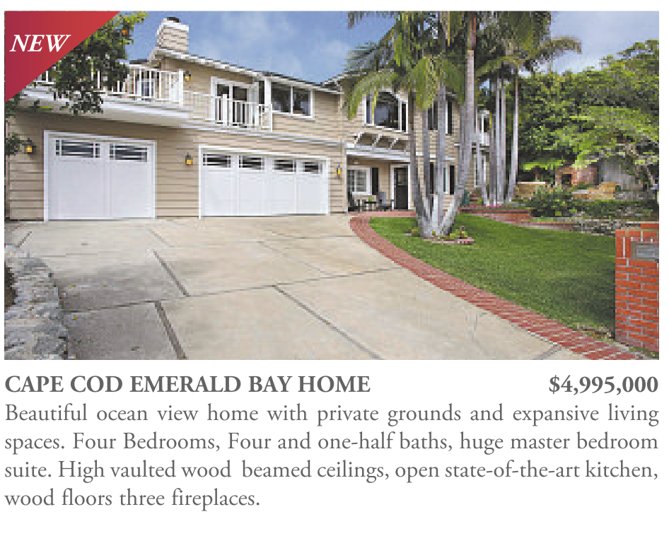 CAPE COD EMERALD BAY HOME $4,995,000 Beautiful ocean view home with private grounds and expansive living spaces. Four Bedrooms, Four and one-half baths, huge master bedroom suite. High vaulted wood beamed ceilings, open state-of-the-art kitchen, wood floors three fireplaces.