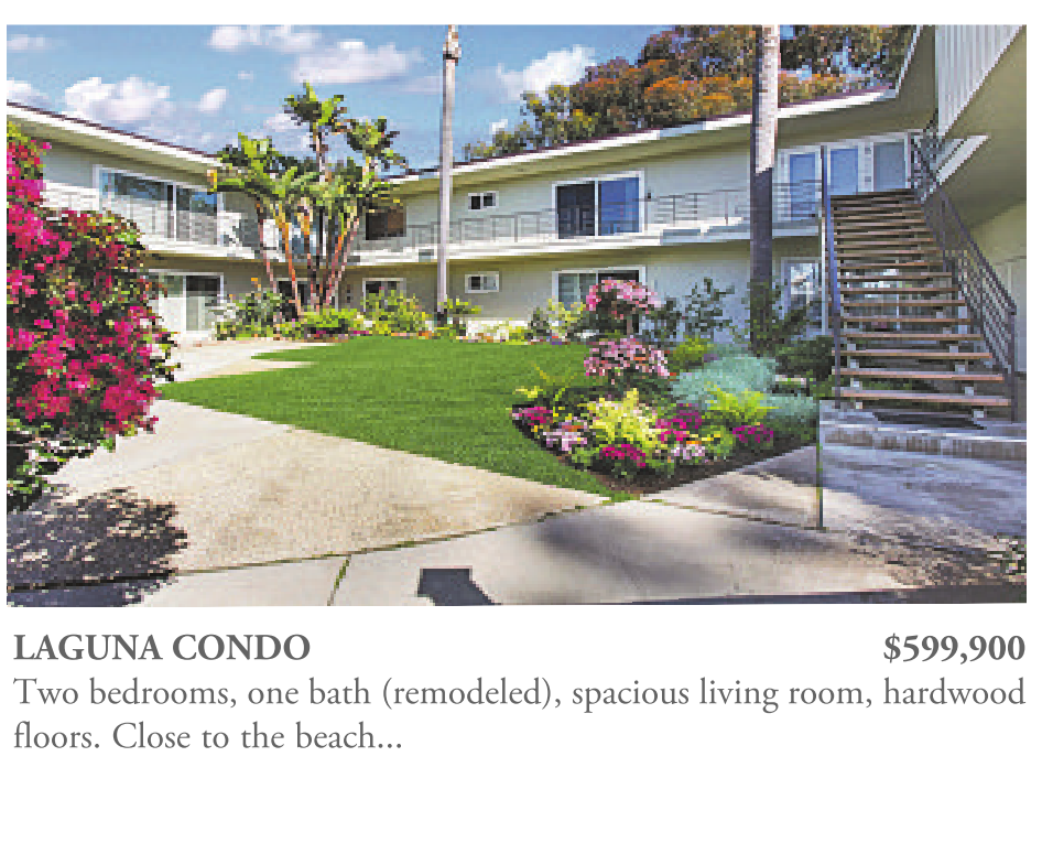 LAGUNA CONDO $599,900 Two bedrooms, one bath (remodeled), spacious living room, hardwood floors. Close to the beach...