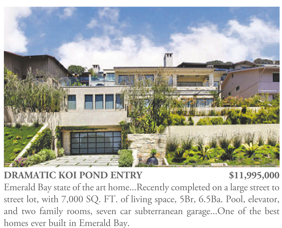 DRAMATIC KOI POND ENTRY $11,995,000 Emerald Bay state of the art home...Recently completed on a large street to street lot, with 7,000 SQ. FT. of living space, 5Br, 6.5Ba. Pool, elevator, and two family rooms, seven car subterranean garage...One of the best homes ever built in Emerald Bay.