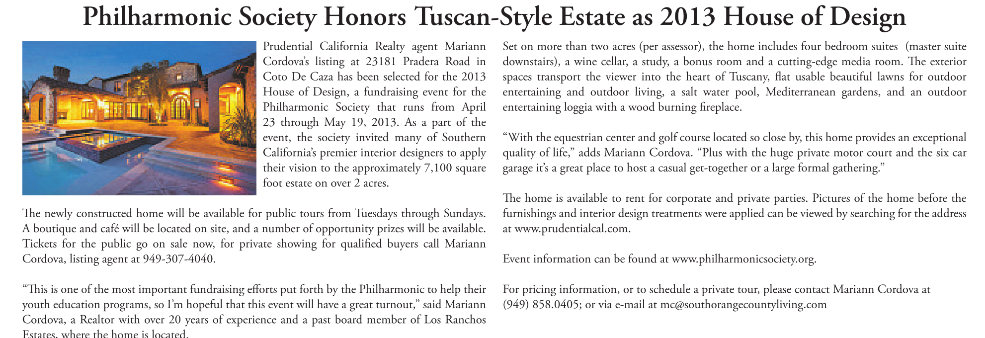 Prudential California Realty agent Mariann Cordova’s listing at 23181 Pradera Road in Coto De Caza has been selected for the 2013 House of Design, a fundraising event for the Philharmonic Society that runs from April 23 through May 19, 2013. As a part of the event, the society invited many of Southern California’s premier interior designers to apply their vision to the approximately 7,100 square foot estate on over 2 acres.