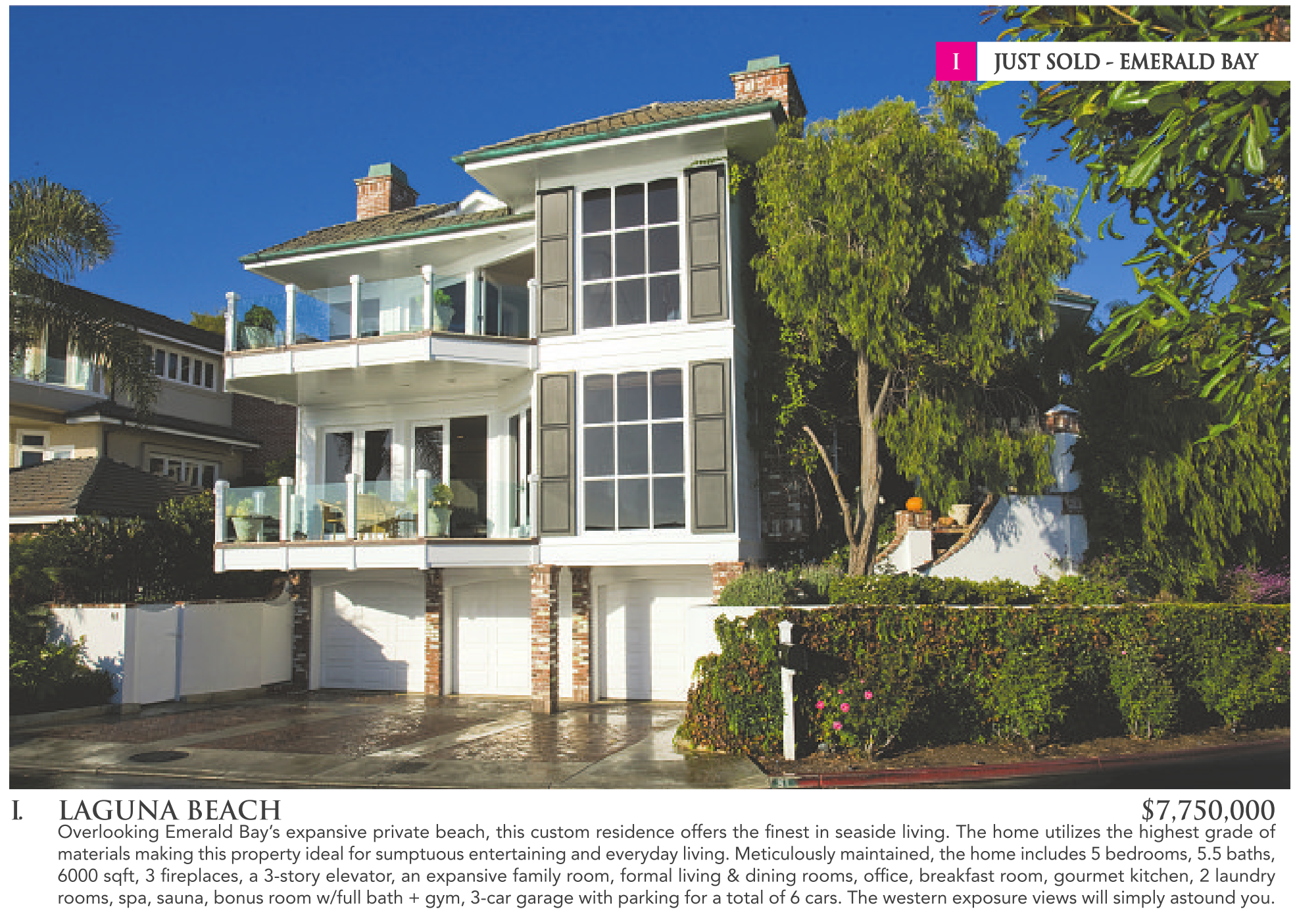IJUST SOLD - EMERALD BAY JUST SOLD - EMERALD BAY I. LAGUNA BEACH $7,750,000 Overlooking Emerald Bay’s expansive private beach, this custom residence offers the finest in seaside living. The home utilizes the highest grade of materials making this property ideal for sumptuous entertaining and everyday living. Meticulously maintained, the home includes 5 bedrooms, 5.5 baths, 6000 sqft, 3 fireplaces, a 3-story elevator, an expansive family room, formal living & dining rooms, office, breakfast room, gourmet kitchen, 2 laundry rooms, spa, sauna, bonus room w/full bath + gym, 3-car garage with parking for a total of 6 cars. The western exposure views will simply astound you.