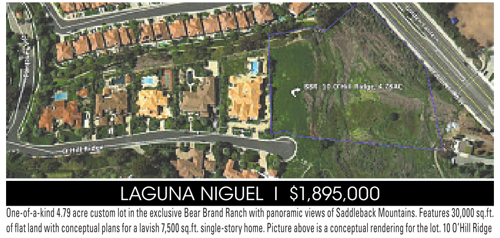 One-of-a-kind 4.79 acre custom lotinthe exclusiveBearBrand Ranchwithpanoramic viewsofSaddleback Mountains.Features30,000 sq.ft. of flatlandwithconceptual plansfor alavish7,500 sq.ft. single-story home.Picture aboveisaconceptual renderingfor thelot.10O’Hill Ridge