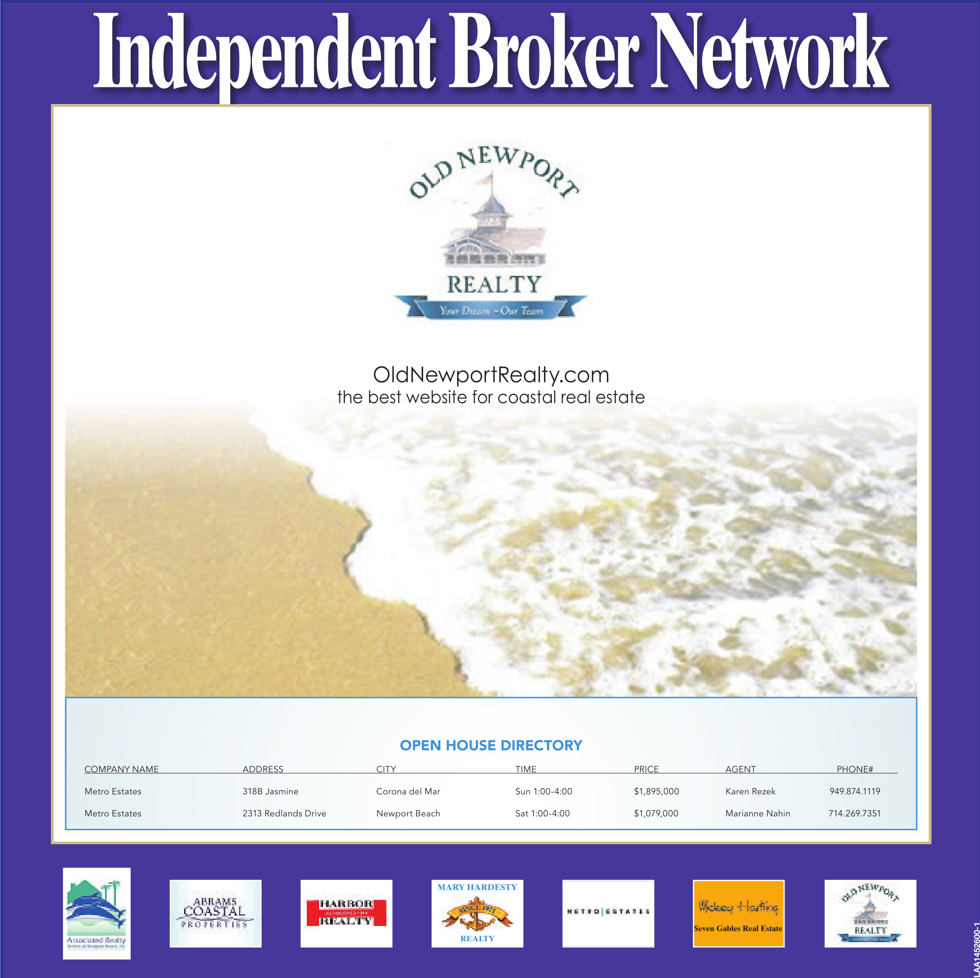 COMPANY NAME ADDRESS CITY TIME PRICE AGENT PHONE# Metro Estates 318B Jasmine Corona del Mar Sun 1:00-4:00 $1,895,000 Karen Rezek 949.874.1119 Metro Estates 2313 Redlands Drive Newport Beach Sat 1:00-4:00 $1,079,000 Marianne Nahin 714.269.7351