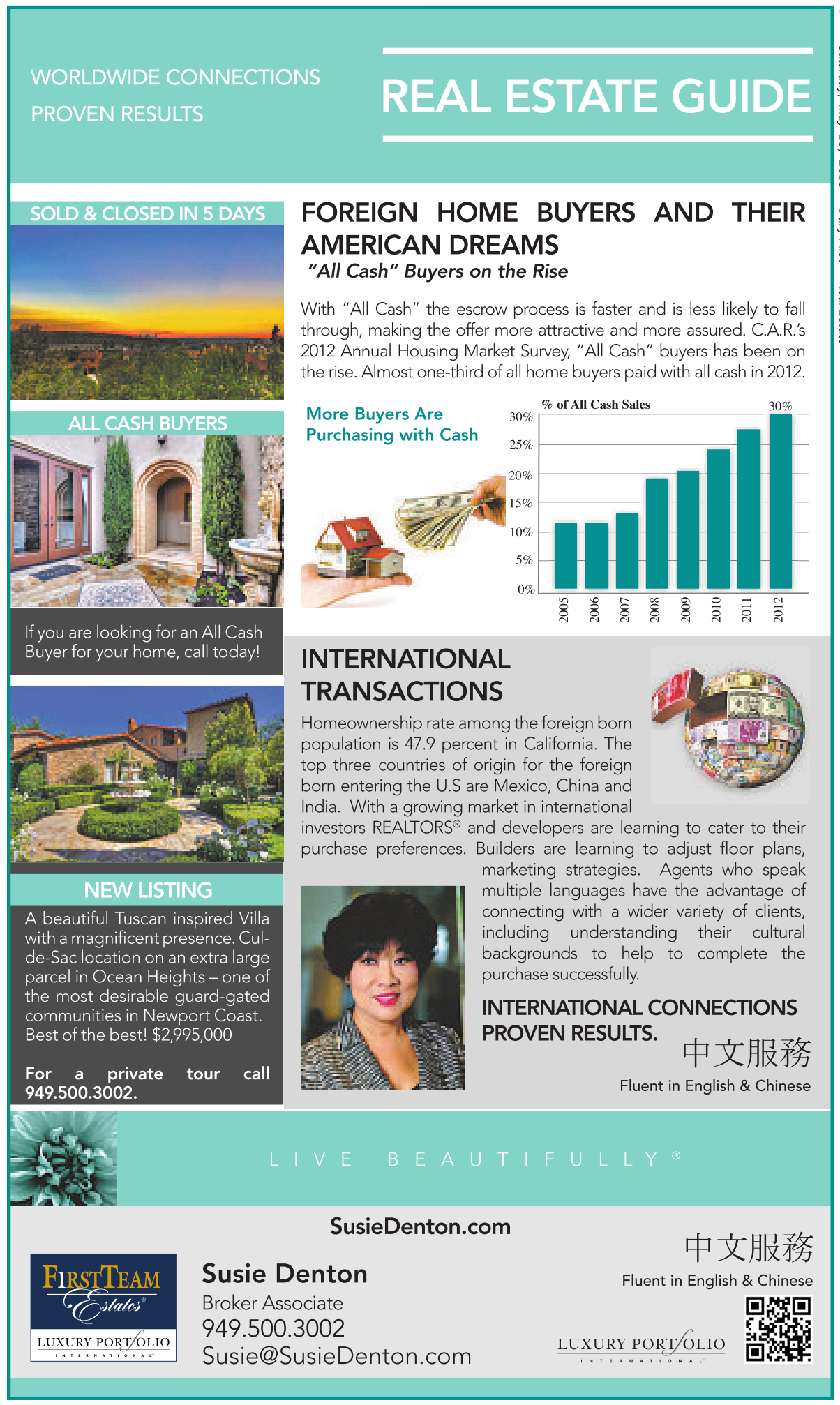 Homeownership rate among the foreign born population is 47.9 percent in California. The top three countries of origin for the foreign born entering the U.S are Mexico, China and India. With a growing market in international investors REALTORS ® and developers are learning to cater to their purchase preferences. Builders are learning to adjust floor plans, marketing strategies. Agents who speak multiple languages have the advantage of connecting with a wider variety of clients, including understanding their cultural backgrounds to help to complete the purchase successfully.