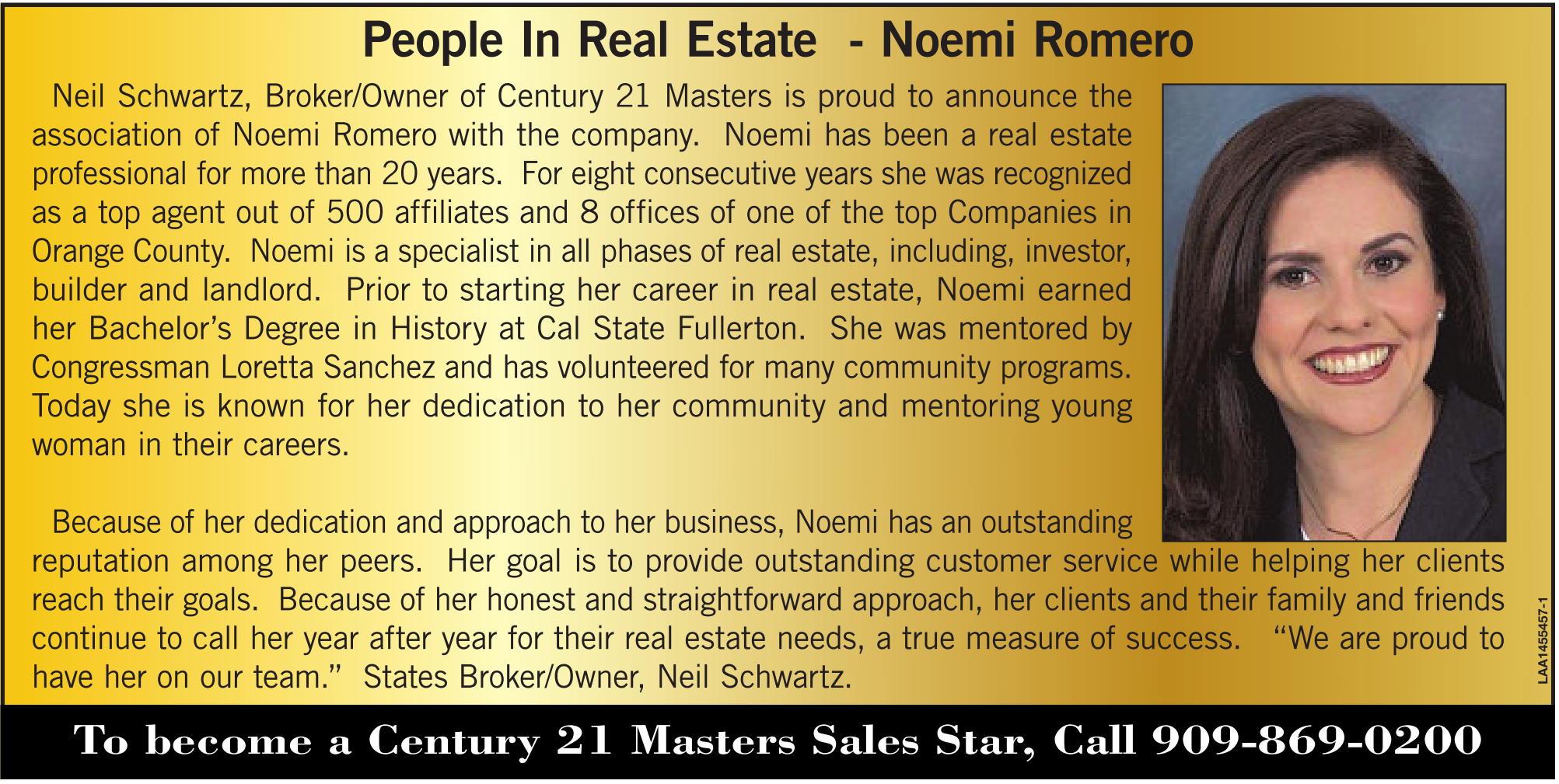 People In Real Estate - Noemi Romero Neil Schwartz, Broker/Owner of Century 21 Masters is proud to announce the association of Noemi Romero with the company. Noemi has been a real estate professional for more than 20 years. For eight consecutive years she was recognized as a top agent out of 500 affiliates and 8 offices of one of the top Companies in Orange County. Noemi is a specialist in all phases of real estate, including, investor, builder and landlord. Prior to starting her career in real estate, Noemi earned her Bachelor’s Degree in History at Cal State Fullerton. She was mentored by Congressman Loretta Sanchez and has volunteered for many community programs. Today she is known for her dedication to her community and mentoring young woman in their careers. Because of her dedication and approach to her business, Noemi has an outstanding reputation among her peers. Her goal is to provide outstanding customer service while helping her clients reach their goals. Because of her honest and straightforward approach, her clients and their family and friends continue to call her year after year for their real estate needs, a true measure of success. “We are proud to have her on our team.” States Broker/Owner, Neil Schwartz. To become a Century 21 Masters Sales Star, Call 909-869-0200