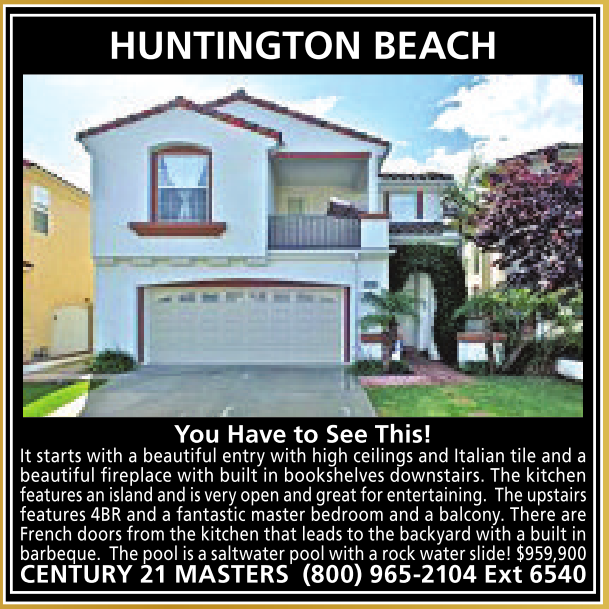 HUNTINGTON BEACH You Have to See This! It starts with abeautiful entry with high ceilings and Italian tile and abeautiful fireplace with built in bookshelves downstairs. The kitchen features an island andisveryopenand greatfor entertaining. Theupstairs features 4BR and afantastic master bedroom and abalcony. There are French doors from the kitchen that leads to the backyard with abuilt in barbeque. The pool is asaltwater pool witharockwater slide! $959,900 CENTURY 21 MASTERS (800) 965-2104 Ext 6540 See also