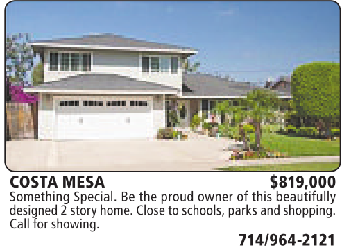 COSTA MESA $819,000 Something Special. Be the proud owner of this beautifully designed2story home. Close to schools, parksand shopping. Call forshowing.