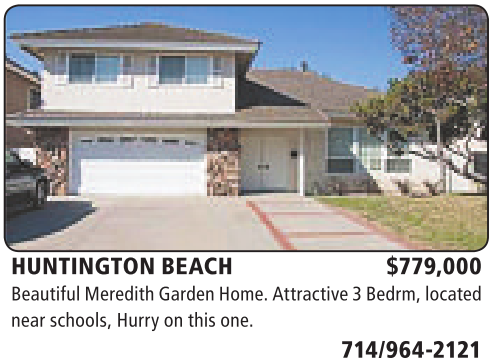 HUNTINGTON BEACH $779,000 BeautifulMeredith Garden Home.Attractive3Bedrm, located near schools,Hurry on this one.