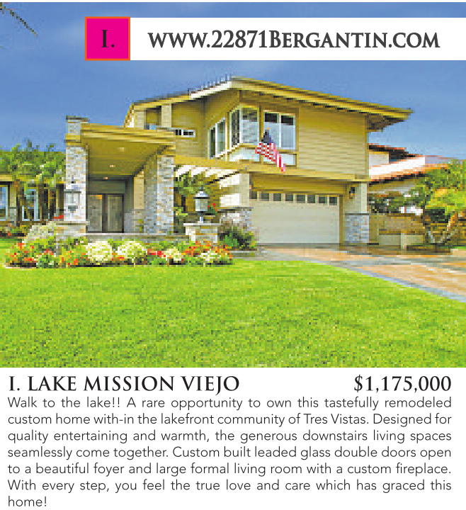 I. www.22871Bergantin.com I. LAKE MISSION VIEJO $1,175,000 Walk to the lake!! A rare opportunity to own this tastefully remodeled custom home with-in the lakefront community of Tres Vistas. Designed for quality entertaining and warmth, the generous downstairs living spaces seamlessly come together.Custom built leaded glass double doors open to a beautiful foyer and large formal living room with a custom fireplace. With every step, you feel the true love and care which has graced this home!