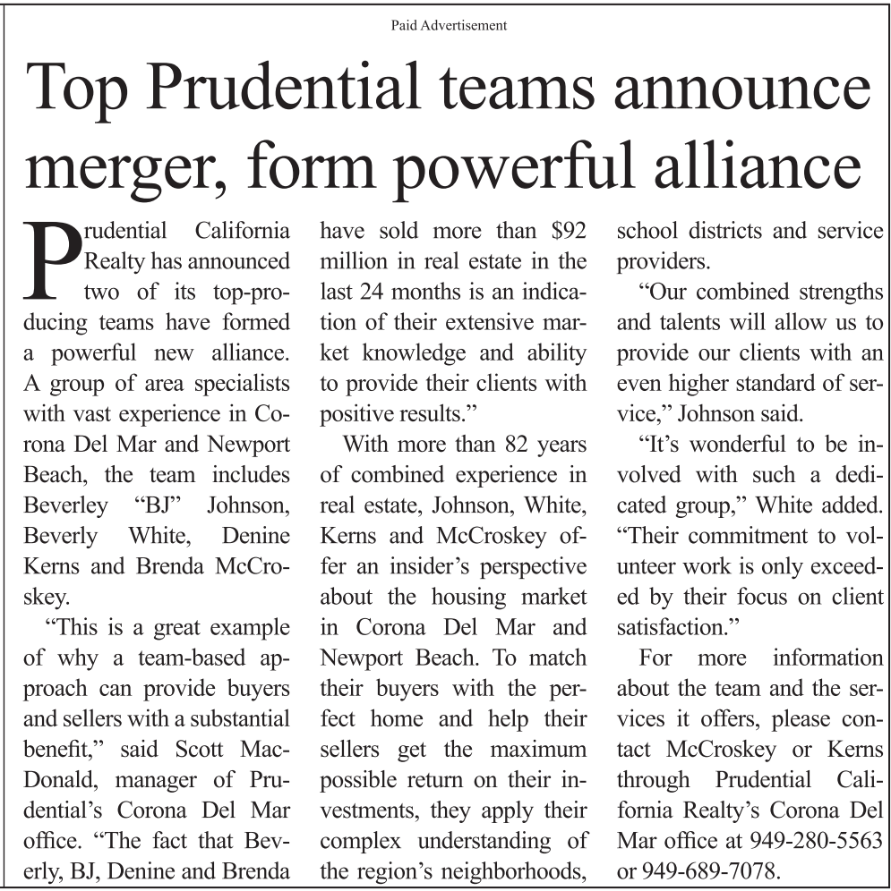 “This is a great example of why a team-based approach can provide buyers and sellers with asubstantial benefit,” said Scott Mac- Donald, manager of Prudential’s Corona Del Mar office. “The fact that Beverly, BJ, Denine and Brenda