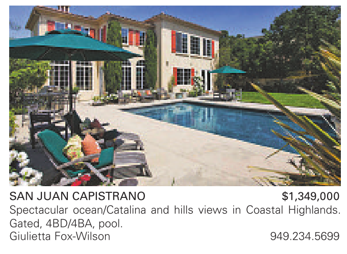SAN JUAN CAPISTRANO $1,349,000 Spectacular ocean/Catalina and hills views in Coastal Highlands. Gated, 4BD/4BA, pool. Giulietta Fox-Wilson 949.234.5699
