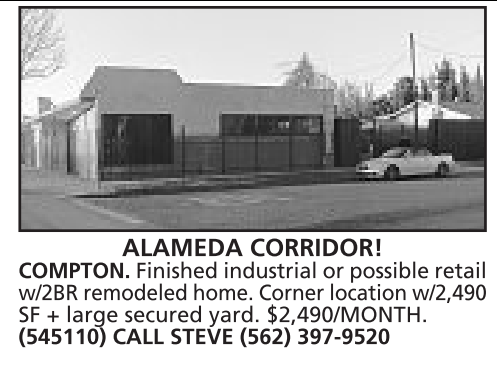 COMPTON. Finished industrial or possible retail w/2BR remodeled home. Corner location w/2,490 SF + large secured yard. $2,490/MONTH. (545110) CALL STEVE (562) 397-9520