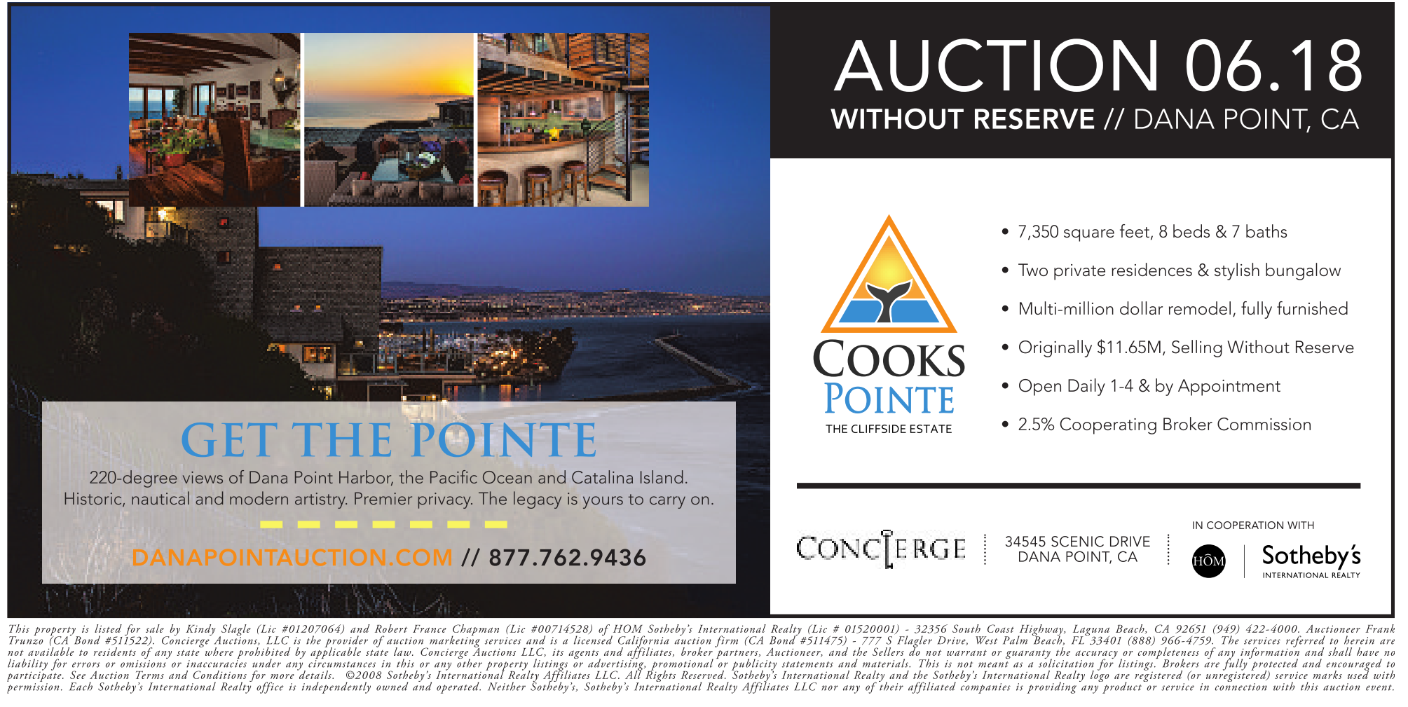 This property is listed for sale by Kindy Slagle (Lic #01207064) and Robert France Chapman (Lic #00714528) of HOM Sotheby’s International Realty (Lic # 01520001) - 32356 South Coast Highway, Laguna Beach, CA 92651 (949) 422-4000. Auctioneer Frank Trunzo (CA Bond #511522). Concierge Auctions, LLC is the provider of auction marketing services and is a licensed California auction firm (CA Bond #511475) - 777 S Flagler Drive, West Palm Beach, FL 33401 (888) 966-4759. The services referred to herein are not available to residents of any state where prohibited by applicable state law. Concierge Auctions LLC, its agents and affiliates, broker partners, Auctioneer, and the Sellers do not warrant or guaranty the accuracy or completeness of any information and shall have no liability for errors or omissions or inaccuracies under any circumstances in this or any other property listings or advertising, promotional or publicity statements and materials. This is not meant as a solicitation for listings. Brokers are fully protected and encouraged to participate. See Auction Terms and Conditions for more details. ©2008 Sotheby’s International Realty Affiliates LLC. All Rights Reserved. Sotheby’s International Realty and the Sotheby’s International Realty logo are registered (or unregistered) service marks used with permission. Each Sotheby’s International Realty office is independently owned and operated. Neither Sotheby’s, Sotheby’s International Realty Affiliates LLC nor any of their affiliated companies is providing any product or service in connection with this auction event.