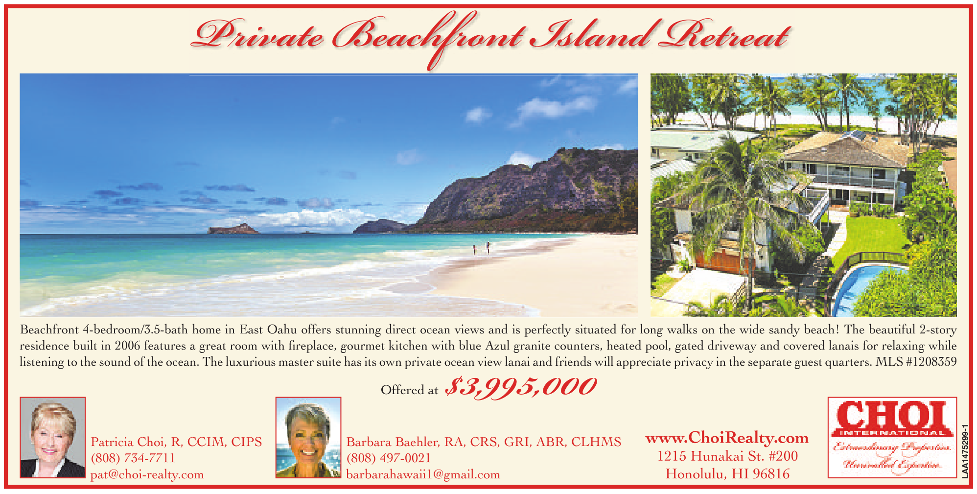 Beachfront 4-bedroom/3.5-bath home in East Oahu offers stunning direct ocean views and is perfectly situated for long walks on the wide sandy beach! The beautiful 2-story residence built in 2006 features a great room with fireplace, gourmet kitchen with blue Azul granite counters, heated pool, gated driveway and covered lanais for relaxing while