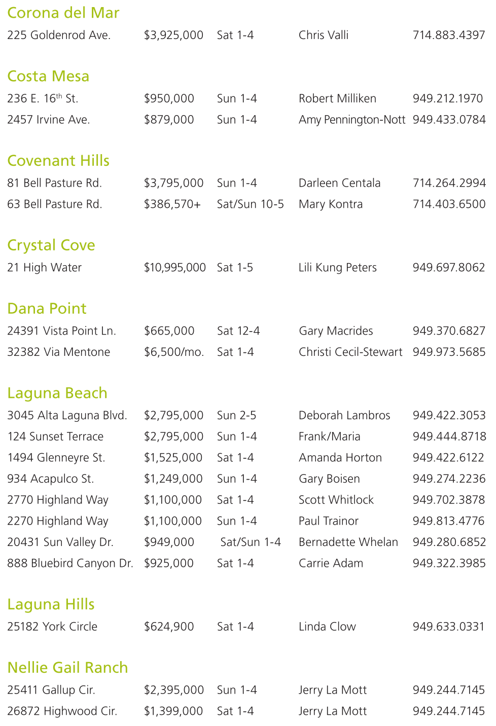 236 E. 16 th St. $950,000 Sun 1-4 Robert Milliken 949.212.1970