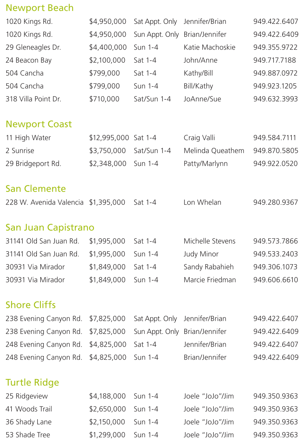 1020 Kings Rd. $4,950,000 SunAppt. Only Brian/Jennifer 949.422.6409 29 Gleneagles Dr. $4,400,000 Sun 1-4 Katie Machoskie 949.355.9722 24 Beacon Bay $2,100,000 Sat 1-4 John/Anne 949.717.7188 504 Cancha $799,000 Sat 1-4 Kathy/Bill 949.887.0972 504 Cancha $799,000 Sun 1-4 Bill/Kathy 949.923.1205 318 Villa Point Dr. $710,000 Sat/Sun 1-4 JoAnne/Sue 949.632.3993
