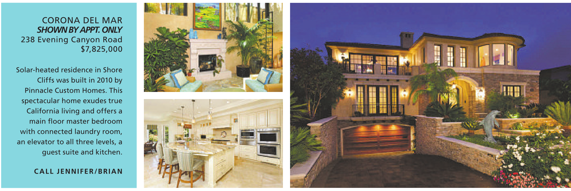 CORONA DEL MAR SHOWNBYAPPT. ONLY 238 Evening Canyon Road $7,825,000 Solar-heated residence in Shore Cliffs was built in 2010 by Pinnacle Custom Homes. This spectacular home exudes true California living and offers a main floor master bedroom with connected laundry room, an elevator to all three levels, a guest suite and kitchen. CALL JENNIFER/BRIAN