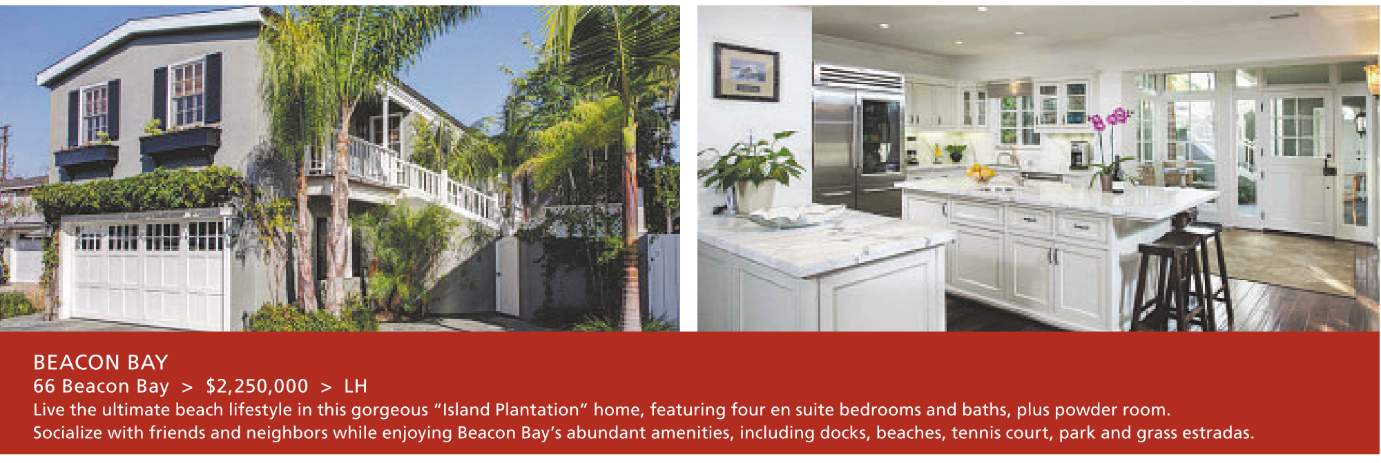 BEACON BAY 66 Beacon Bay > $2,250,000 > LH Live the ultimate beach lifestyle in this gorgeous “Island Plantation” home, featuring four en suite bedrooms and baths, plus powder room. Socialize with friends and neighbors while enjoying Beacon Bay’s abundant amenities, including docks, beaches, tennis court, park and grass estradas.