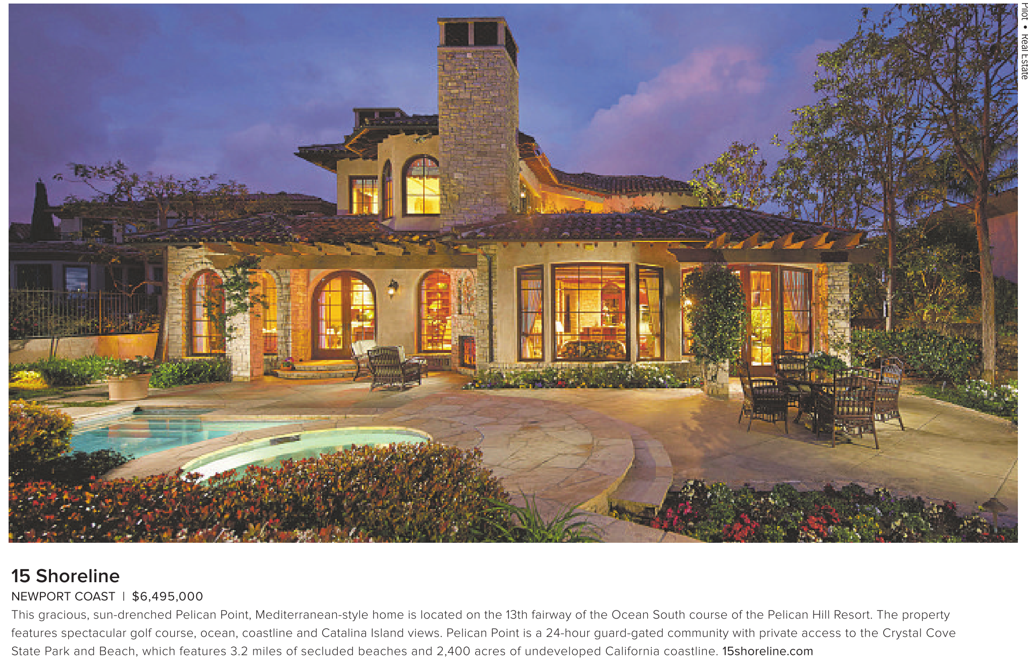 NEWPORT COAST | $6,495,000 This gracious, sun-drenched Pelican Point, Mediterranean-style home is located on the 13th fairway of the Ocean South course of the Pelican Hill Resort. The property features spectacular golf course, ocean, coastline and Catalina Island views. Pelican Point is a 24-hour guard-gated community with private access to the Crystal Cove State Park and Beach, which features 3.2 miles of secluded beaches and 2,400 acres of undeveloped California coastline. 15shoreline.com