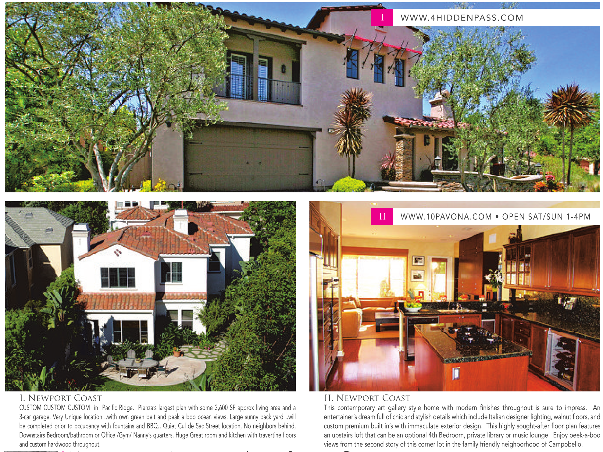 I WWW.4HIDDENPASS.COM II II WWW.10PAVONA.COM • OPEN SAT/SUN 1-4PM I. Newport Coast CUSTOM CUSTOM CUSTOM in Pacific Ridge. Pienza’s largest plan with some 3,600 SF approx living area and a 3-car garage. Very Unique location ..with own green belt and peak a boo ocean views. Large sunny back yard ..will be completed prior to occupancy with fountains and BBQ…Quiet Cul de Sac Street location, No neighbors behind, Downstairs Bedroom/bathroom or Office /Gym/ Nanny’s quarters. Huge Great room and kitchen with travertine floors and custom hardwood throughout. II. Newport Coast This contemporary art gallery style home with modern finishes throughout is sure to impress. An entertainer’sdream full of chic and stylish details which include Italian designer lighting, walnut floors, and custom premium built in’s with immaculate exterior design. This highly sought-after floor plan features an upstairs loft that can be an optional 4th Bedroom, private library or music lounge. Enjoy peek-a-boo views from the second story of this corner lot in the family friendly neighborhood of Campobello. Anne Staven Gualter