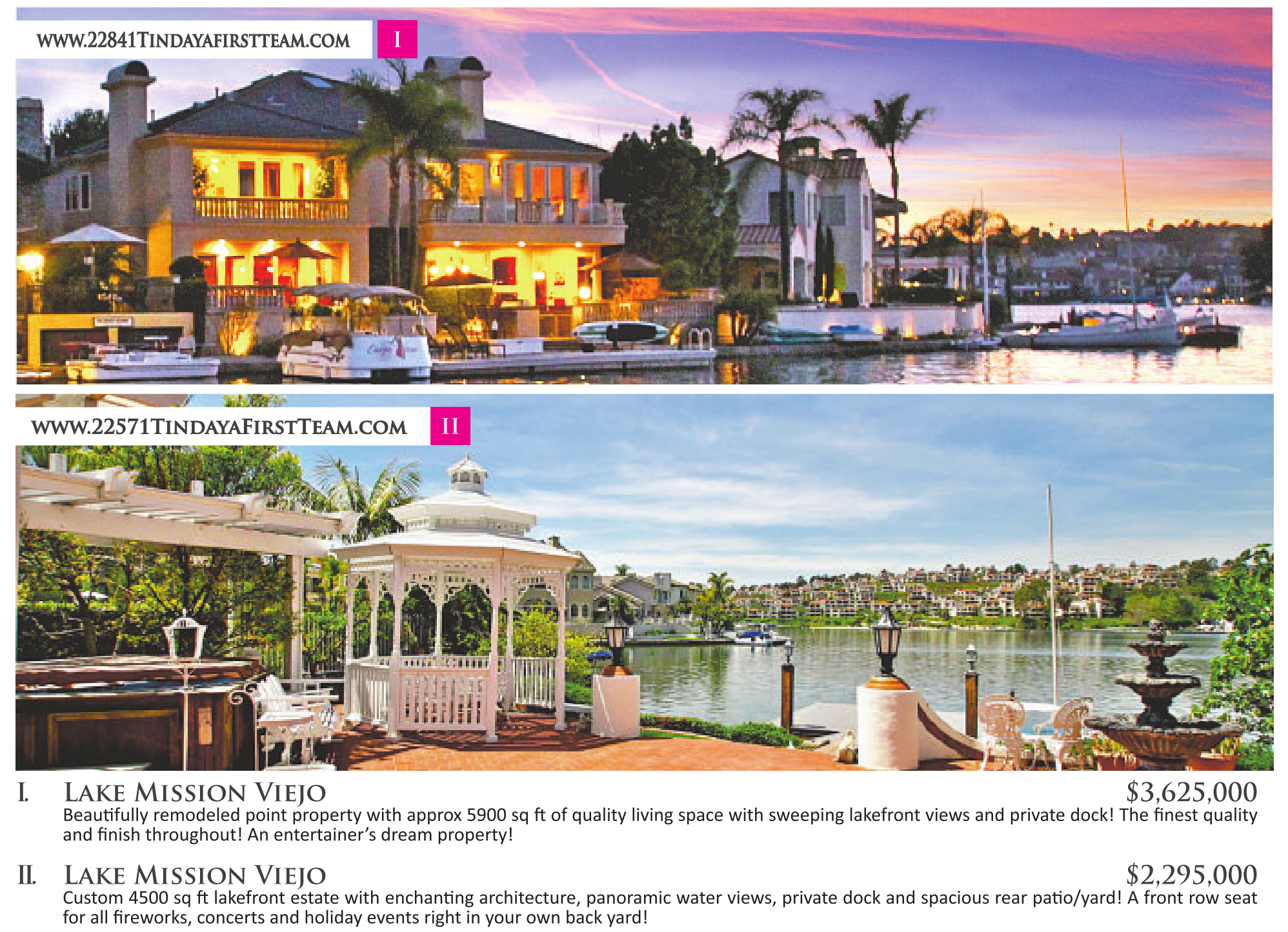 www.22841Tindayafirstteam.com www.22841Tindayafirstteam.com Iwww.22571TindayaFirstTeam.com www.22571TindayaFirstTeam.com II I. Lake Mission Viejo $3,625,000 Beau fully remodeled point property with approx 5900 sq of quality living space with sweeping lakefront views and private dock! The finest quality and finish throughout! An entertainer’s dream property! II. Lake Mission Viejo $2,295,000 Custom 4500 sq lakefront estate with enchan ng architecture, panoramic water views, private dock and spacious rear pa o/yard! A front row seat for all fireworks, concerts and holiday events right in your own back yard!