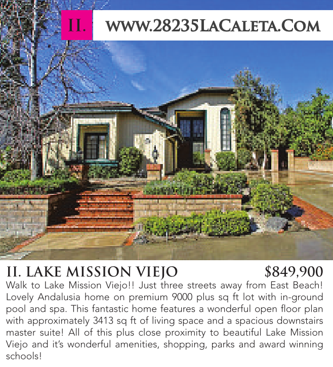 II. www.28235LaCaleta.Com II. LAKE MISSION VIEJO $849,900 Walk to Lake Mission Viejo!! Just three streets away from East Beach! Lovely Andalusia home on premium 9000 plus sq ft lot with in-ground pool and spa. This fantastic home features a wonderful open floor plan with approximately 3413 sq ft of living space and a spacious downstairs master suite! All of this plus close proximity to beautiful Lake Mission Viejo and it’s wonderful amenities, shopping, parks and award winning schools!