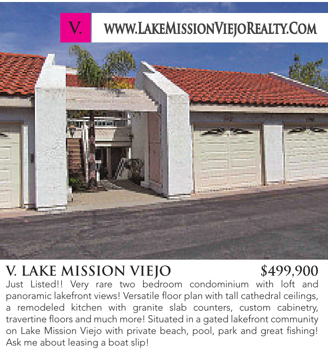 V. www.LakeMissionViejoRealty.Com V. LAKE MISSION VIEJO $499,900 Just Listed!! Very rare two bedroom condominium with loft and panoramic lakefront views! Versatile floor plan with tall cathedral ceilings, a remodeled kitchen with granite slab counters, custom cabinetry, travertine floors and much more! Situated in agated lakefront community on Lake Mission Viejo with private beach, pool, park and great fishing! Ask me about leasing aboat slip!