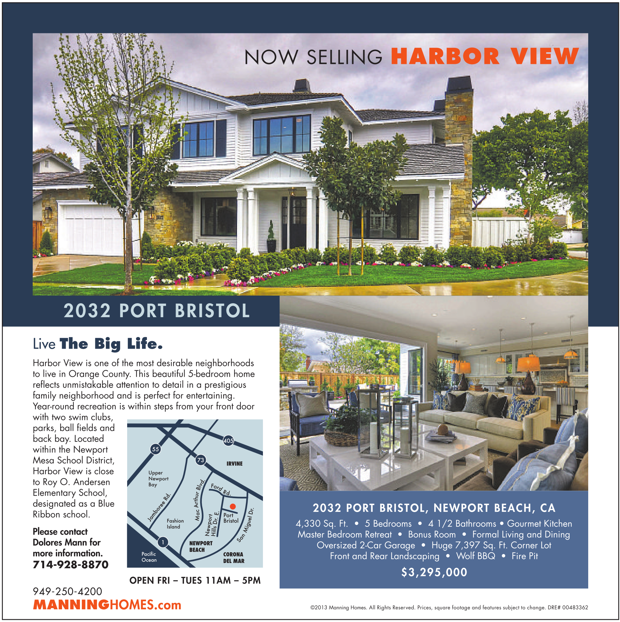 NOW SELLING HARBOR VIEW 2 0 3 2 P O RT B R I S T O L Live The Big Life. Harbor View is one of the most desirable neighborhoods to live in Orange County. This beautiful 5-bedroom home reflects unmistakable attention to detail in a prestigious family neighborhood and is perfect for entertaining. Year-round recreation is within steps from your front door with two swim clubs, parks, ball fields and back bay. Located within the Newport Mesa School District, Harbor View is close to Roy O. Andersen Elementary School, designated as a Blue Ribbon school. Please contact Dolores Mann for more information. 714-928-8870 949-250-4200 MANNINGHOMES.com OPEN FRI – TUES 11AM – 5PM 2032 PORT BRISTOL, NEWPORT BEACH, CA $3,295,000 ©2013 Manning Homes. All Rights Reserved. Prices, square footage and features subject to change. DRE# 00483362