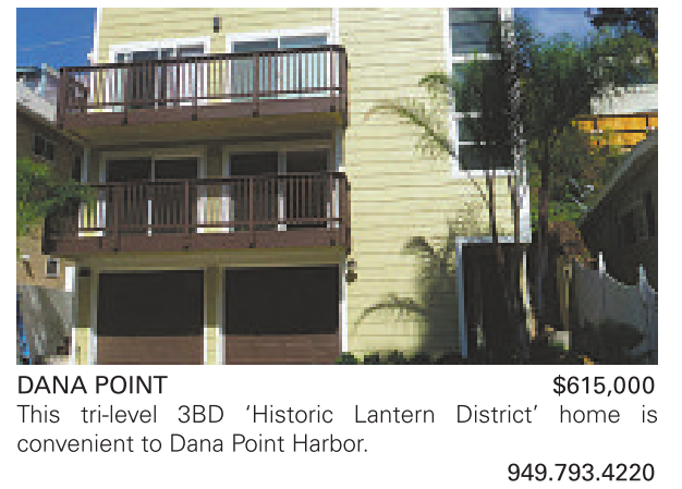 DANA POINT $615,000 This tri-level 3BD ‘Historic Lantern District’ home is convenient to Dana Point Harbor.