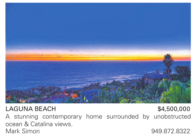 LAGUNA BEACH $4,500,000 A stunning contemporary home surrounded by unobstructed ocean & Catalina views. Mark Simon 949.872.8322