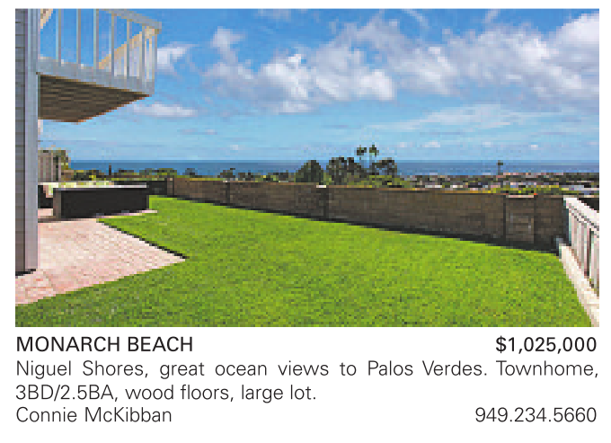 MONARCH BEACH $1,025,000 Niguel Shores, great ocean views to Palos Verdes. Townhome, 3BD/2.5BA, wood floors, large lot. Connie McKibban 949.234.5660