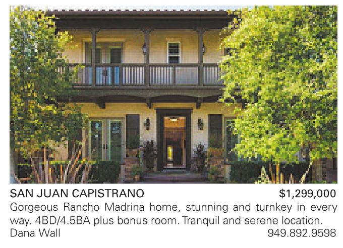 SAN JUAN CAPISTRANO $1,299,000 Gorgeous Rancho Madrina home, stunning and turnkey in every way. 4BD/4.5BA plus bonus room. Tranquil and serene location. Dana Wall 949.892.9598