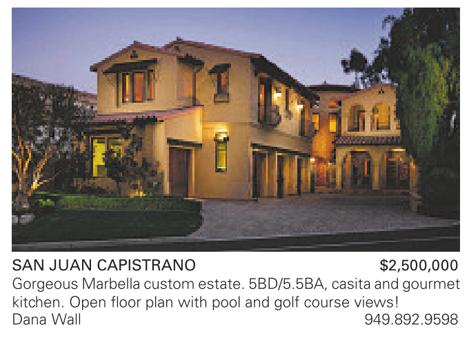 SAN JUAN CAPISTRANO $2,500,000 Gorgeous Marbella custom estate. 5BD/5.5BA, casitaand gourmet kitchen. Open floor plan with pool and golf course views! Dana Wall 949.892.9598