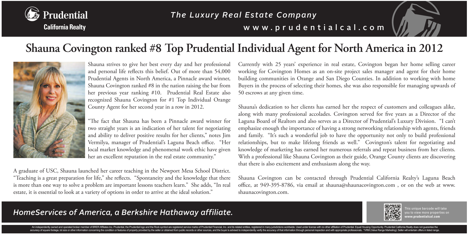 Shauna strives to give her best every day and her professional and personal life reflects this belief. Out of more than 54,000 Prudential Agents in North America, a Pinnacle award winner, Shauna Covington ranked #8 in the nation raising the bar from her previous year ranking #10. Prudential Real Estate also recognized Shauna Covington for #1 Top Individual Orange County Agent for her second year in a row in 2012.
