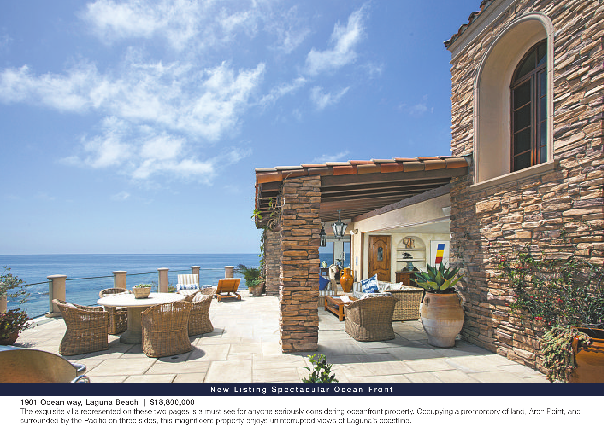 1901 Ocean way, Laguna Beach | $18,800,000 The exquisite villa represented on these two pages is a must see for anyone seriously considering oceanfront property. Occupying a promontory of land, Arch Point, and surrounded by the Pacific on three sides, this magnificent property enjoys uninterrupted views of Laguna’s coastline.